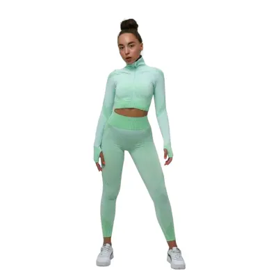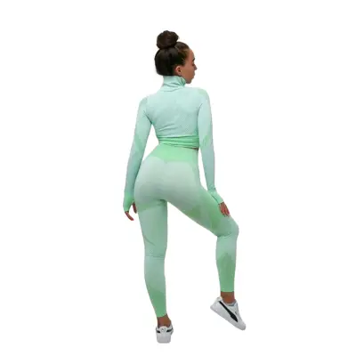 Сочетание актуальных текстильных технологий с современными материалами позволило создать яркий и стильный костюм для фитнеса, который подойдёт как для занятий в зале, так и для занятий на улице. Использование ткани, произведённой по технологии Biflex позволило создать костюм, который плотно прилегает к телу за счёт высокой степени растягивания, что не сковывает движений, обеспечивая комфортный теплообмен. Использование в ткани костюма для фитнеса нейлона делают данный костюм износостойким, выдерживая длительное ношение, одновременно защищая от попадания влаги. Плотное прилегание обеспечивает компрессию тела, улучшая кровообращение за счёт сжатия группы мышц, позволяя длительное время заниматься тренировками. Удобные манжеты с вырезом под пальцы позволяет с комфортом использовать спортивный инвентарь. Спортивный костюм не выцветает под действием солнечных лучей и не теряет свою форму и свойства даже после множественной стирки. В комплект костюма входят рашгард и леггинсы, позволяя носить их по отдельности. Яркий дизайн мятного цвета позволяет подчеркнуть спортивный стиль и контрастировать на фоне.Характеристики: