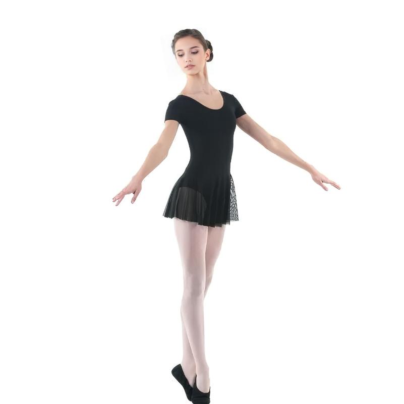 Гимнастический купальник с коротким рукавом и юбочкой из мелкой сетки, отличный вариант для маленьких танцовщиц. Классический вырез спинки и средний окат ноги не будут сковывать движений при выполнении танцевальных элементов. Натуральный материал приятен к телу и хорошо сохраняет первоначальный внешний вид за счет добавления синтетических нитей.